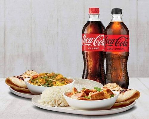 One Small Meat Curry and One Small Vegetable Curry with rice and choice of Any Two Coca-Cola 600ml Varieties