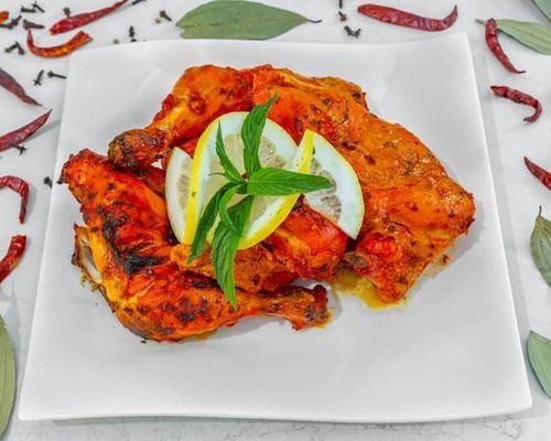 Tandoori marinated half chicken with bones cooked in charcoal tandoor. Served with mint chutney.