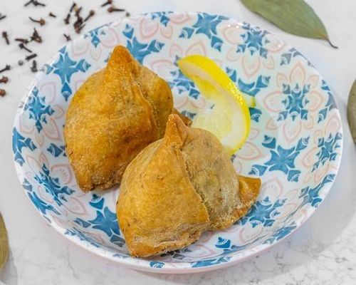 Two pieces. Triangular shaped pastry filled with potatoes, peas and spices. Served with tamarind sauce.